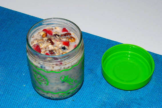 Convém ser um frasco fechado...deitam tudo lá para dentro, cobrem com leite, deitam um pouquinho mais porque a aveia e a chia ganham volume ao hidratar e deixam no frigorifico.